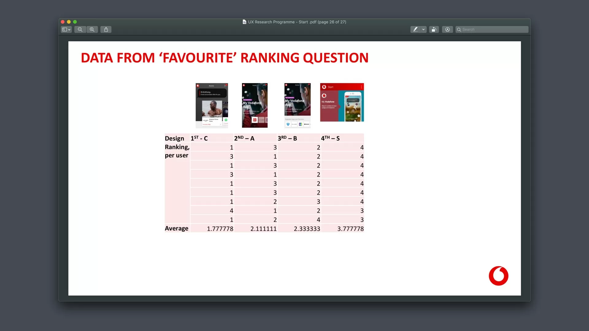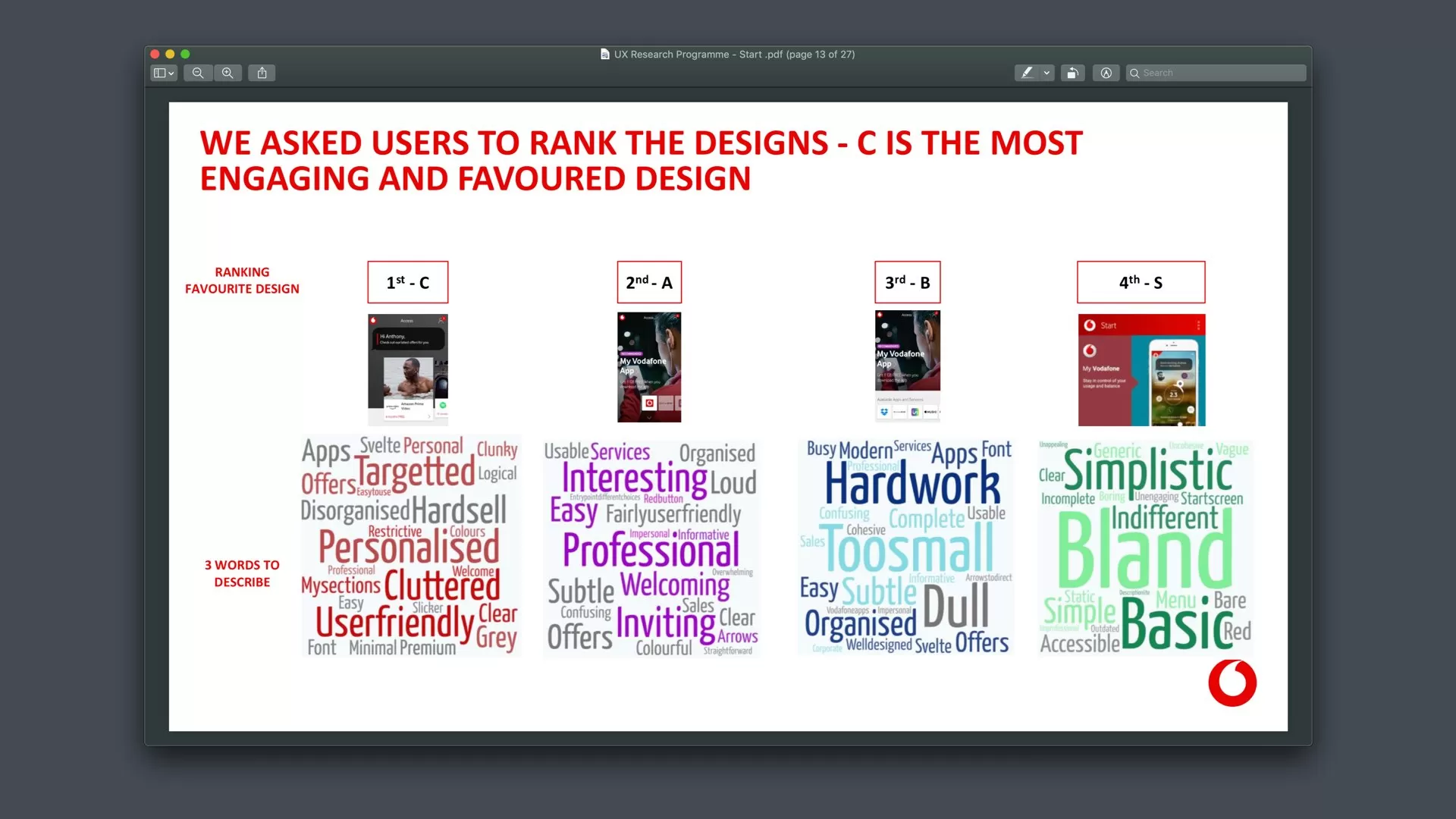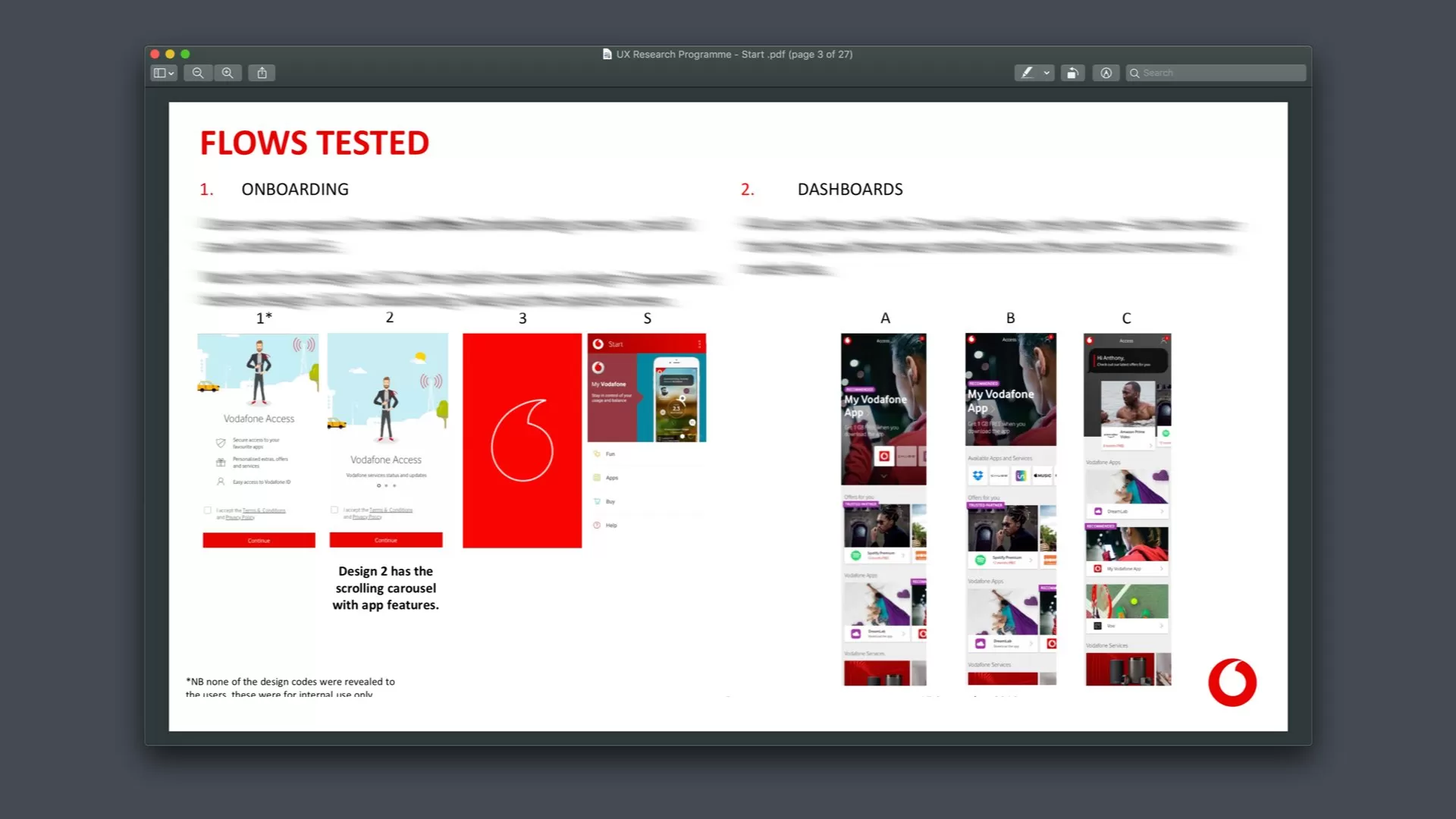 In an Agile context minimum documentation is paramount. However, comprehensive documentation was created to support handover to Vodafone’s design team and communication with stakeholders
